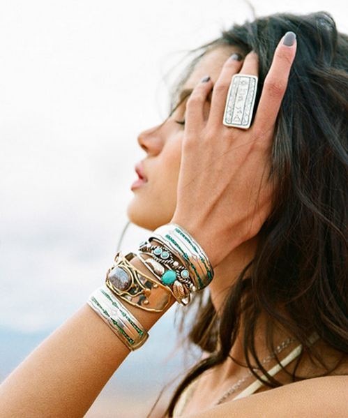 E a ideia é num lado se valer de várias pulseiras pra encher um pulso e usar pelo menos um anel substancial na mão pra arrematar. Se você não souber misturar materiais, fique com dourado ou prateado pra essa. Pode ainda misturar com um destes elementos couro, tecido sem medo de ser feliz.