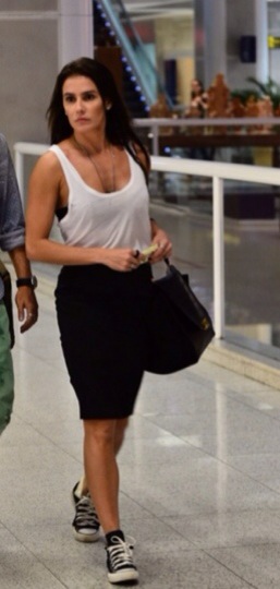 Executado da forma mais simples: com saia preta e regatinha branca. O tênis sem meia poderia ser na cor que desejasse, mas um preto dá um leve up no look. Dar uma dobrada no cano do tênis de cano longo é uma possibilidade que dá mais samba do que usar o cano alto. Um tênis sem cano seria uma melhor opção.