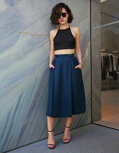 Confesso: não sou a maior fã do crop top. Mas achei bem fofo este look com saia midi cheinha e sandália. Ficou elegantezinho e descolado. E o combo preto com azul também contrubuiu pra gostabilidade do look. Dito isso, não gostei ao ponto de querer experimentar, mesmo porque minha barriga é positiva demais pra tentar um look destes.
