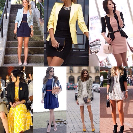 Uma boa é manetr o vestido mais comprido do que a barra do blazer.