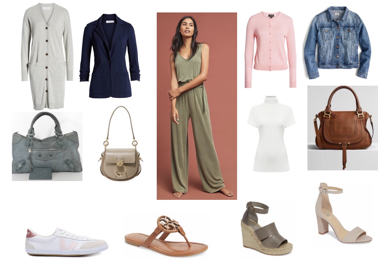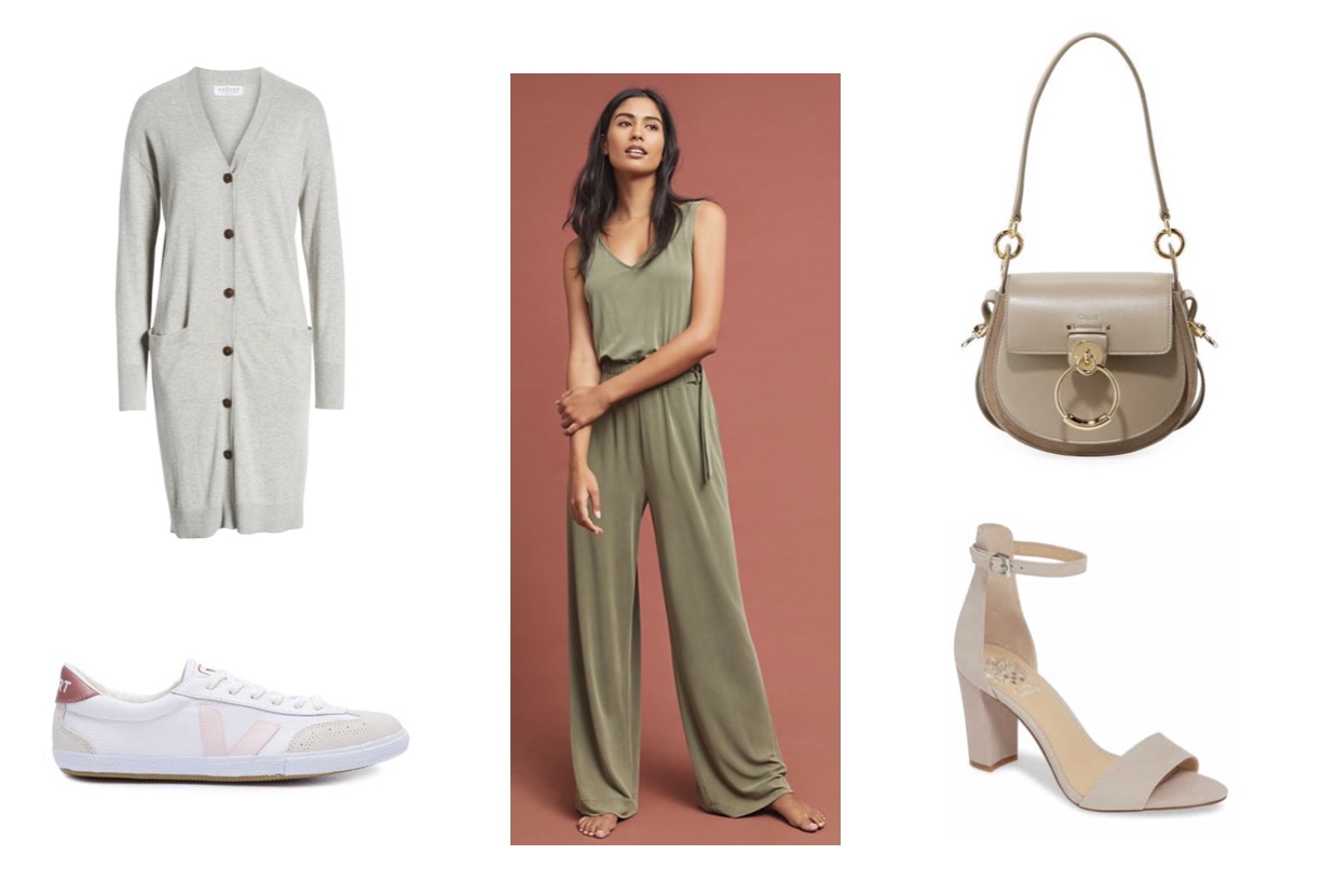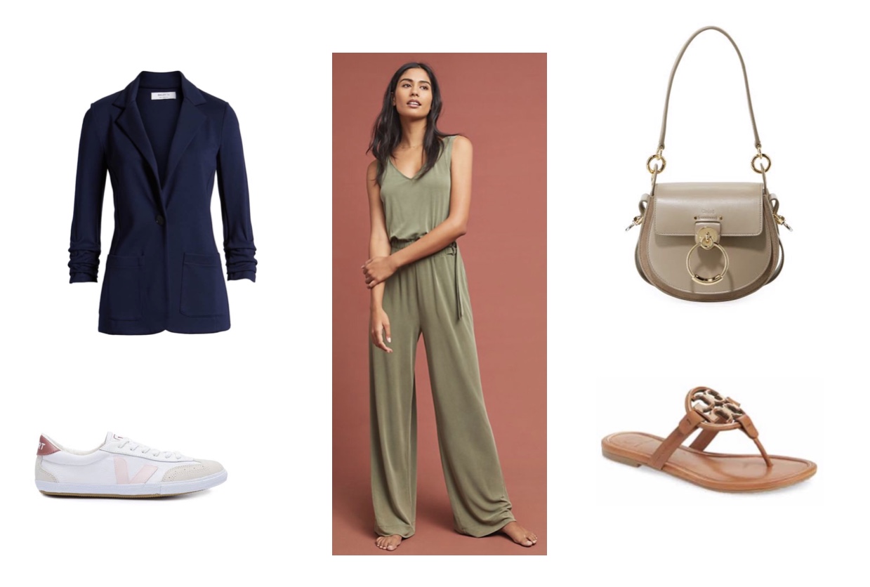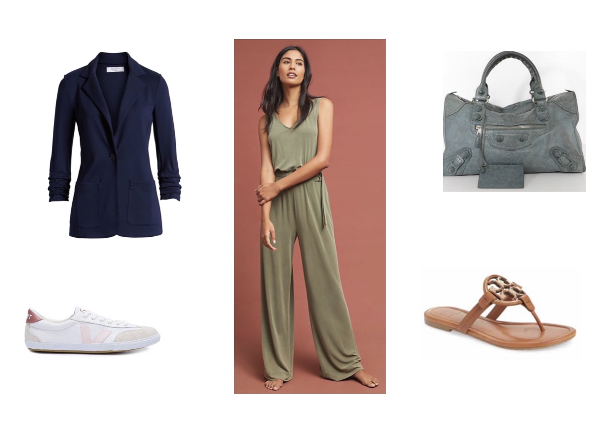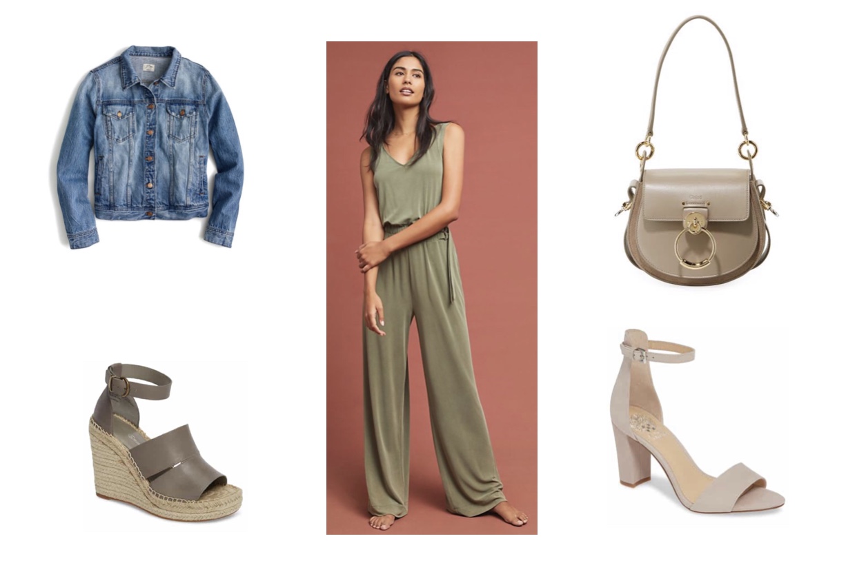 Aqui é uma versão mais despojada do macacão com tênis, rasteirinha, jaqueta jeans e uma bolsa grandona, pro dia a dia. Macacão que é num tom de cáqui verde, ou seja, neutro e por isso conversa bem com qualquer outra cor. Evitaria usar um sapato preto. Marrom, cinza, bege, branco, off-white, marinho e de cor como roxo ou bordô seriam melhores opções.