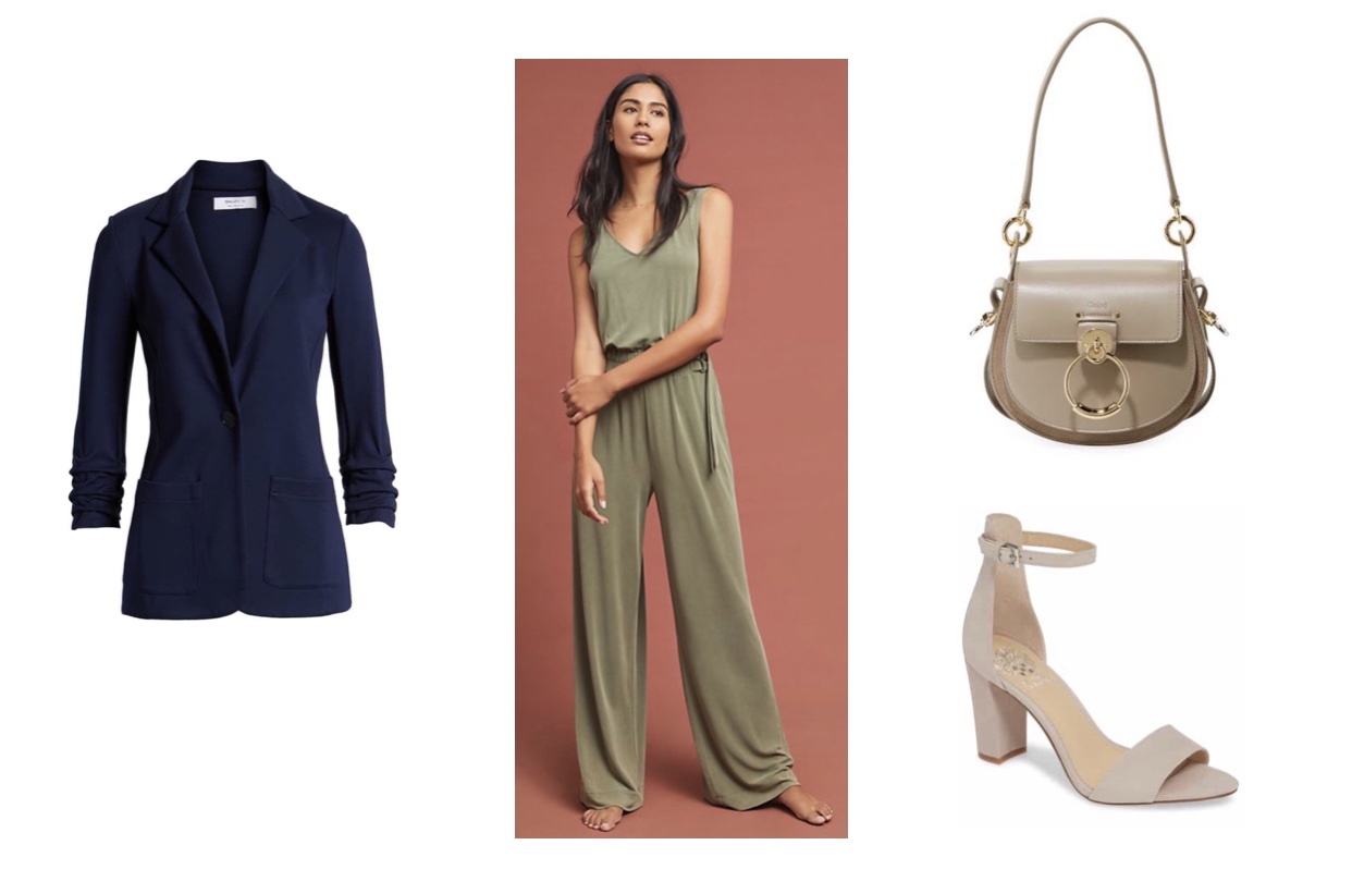 E por fim tem um dress up do macacão com blazer marinho, bolsa pequena e sandália de salto alto. O look se manteria up mesmo usando o top de gola por dentro nessa.