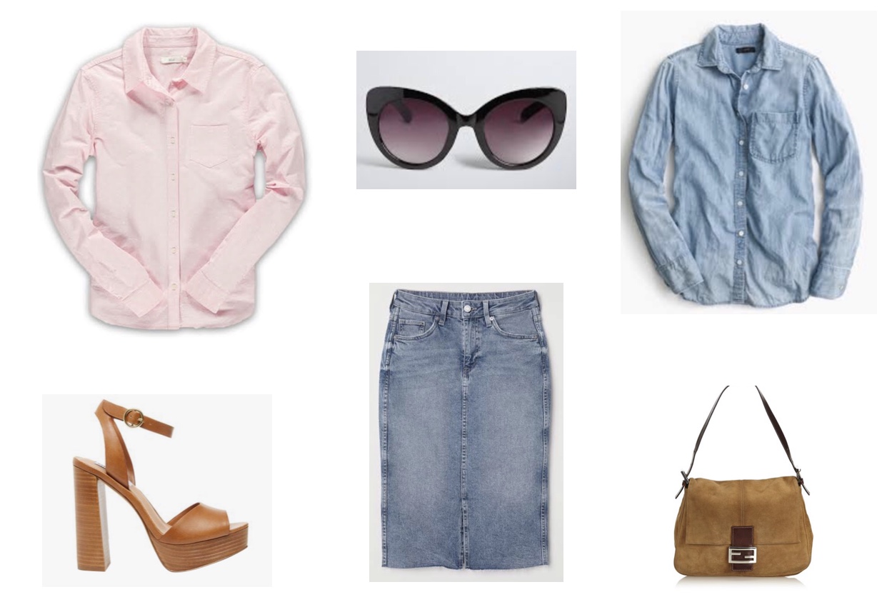 Aqui a plataforma é bem curinga: marrom. E a bolsa idem. A diferentada fica por conta de uma ser de camurça e a outra ser de couro. E o look também envolve peças curingonas do seu guarda-roupa: uma saia jeans lápis e uma camisa chambray, denim ou rosinha ou na cor que desejar.