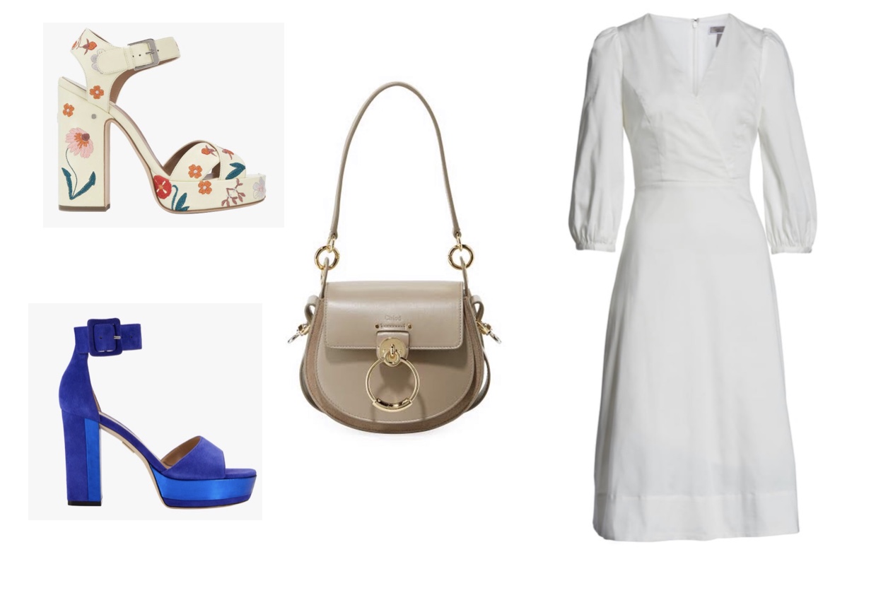 Aqui a ideia é se valer de um vestido branco mais arrumadinho e apostar numa plataforma de cor vibrante ou estampada pra dar um chica chica boom no look. A bolsa pequena e neutra fecha a montada.