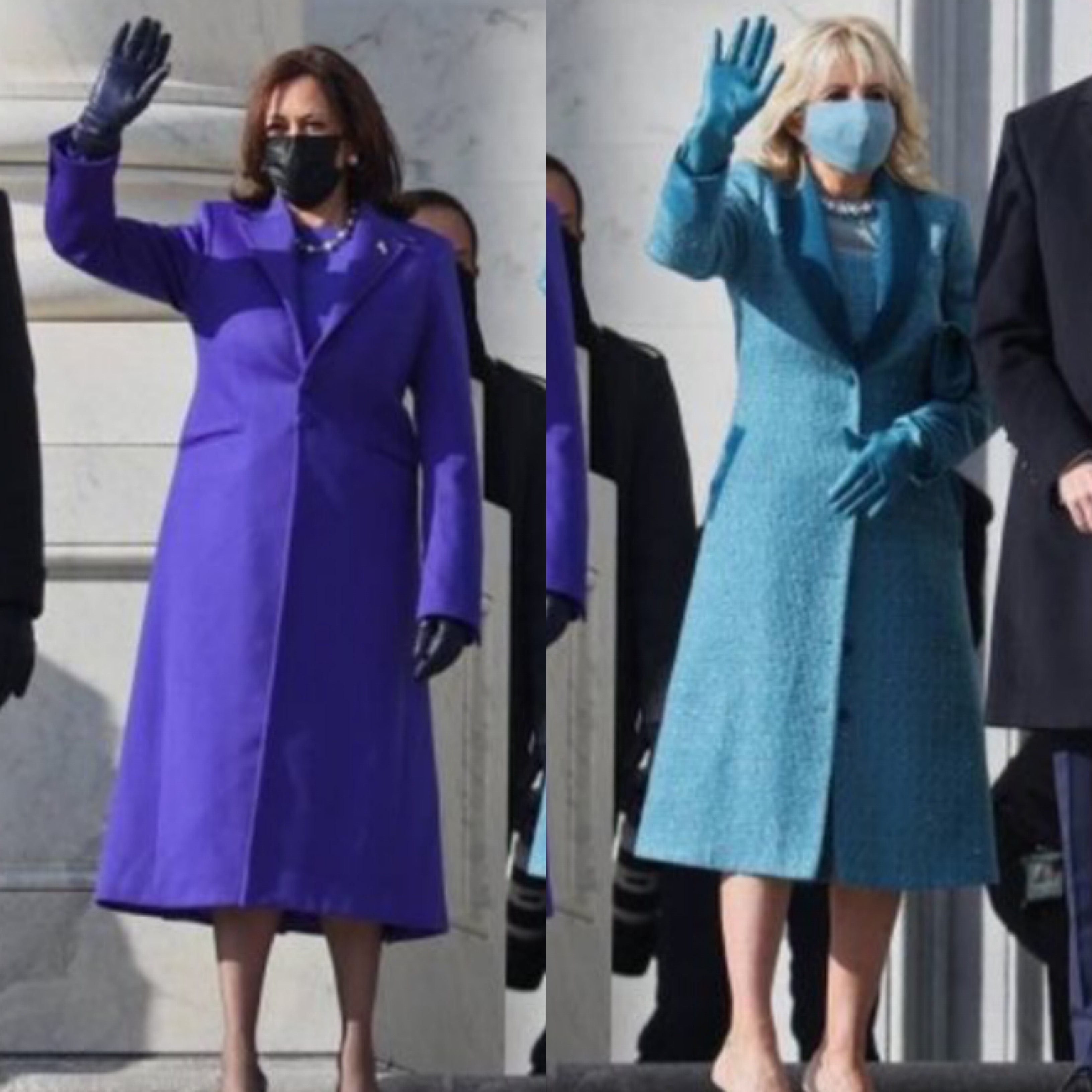 A VP Kamala Harris apostou no roxo nada discreto e no designer negro e americano Christopher John Rogers pra assinar o seu look no seu dia histórico. Já a Primeira-Dama Dr. Jill Biden ficou com o azul num tom mais discreto e vívido, num look da marca americana Markarian.