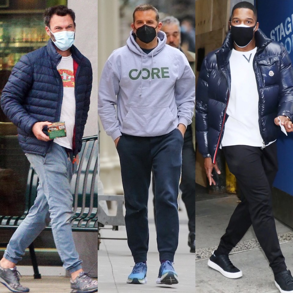 E um outro detalhe a se notar: tênis chamando a atenção pra si na versão estampado, colorido e no contraste do preto com branco, contraste que o Michael Strahan usa também na sua máscara dupla.