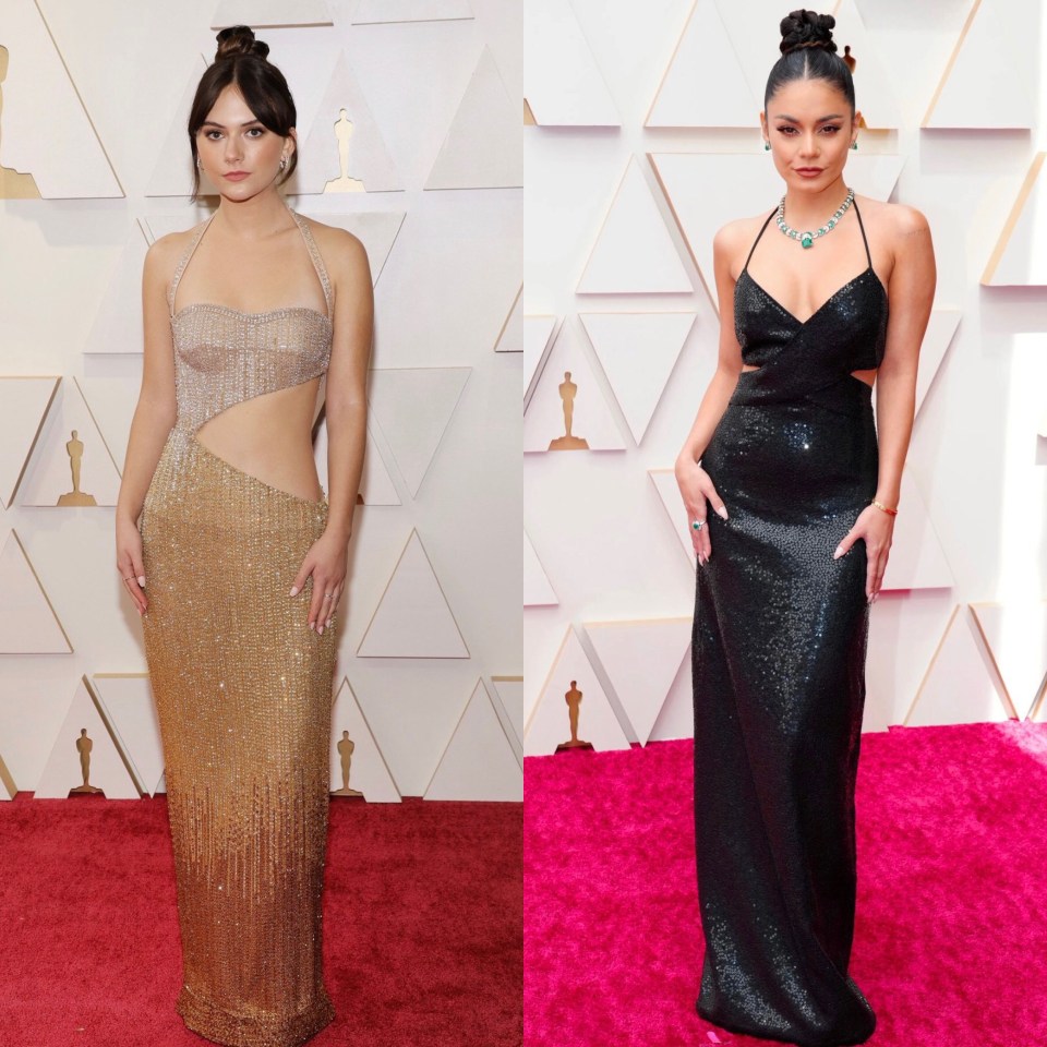 Recortes que dão uma revelada extra de pele também é tendência. Como ilustra a Emilia Jones de Dolce & Gabbana e a Vanessa Hudgens de Michael Kors. Lembrando que um recorte mais discreto como o da Vanessa Hudgens costuma funcionar melhor para a vida real.
