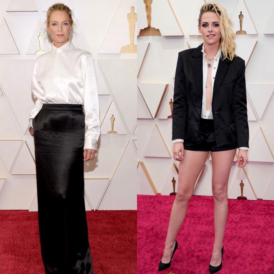 Que tanto pode ser num look pra lá de elegante e minimalista como este da Uma Thurman de camisa masculina de seda branca e saia comprida preta (que super poderia ser uma calça, pantalona também) da Bottega Veneta como neste mais modernex e desconstruído da Kristen Stewart com camisa infinitamente aberta e shortinho mini (que também poderia ser transformado em calça comprida, skinny por exemplo) da Chanel.